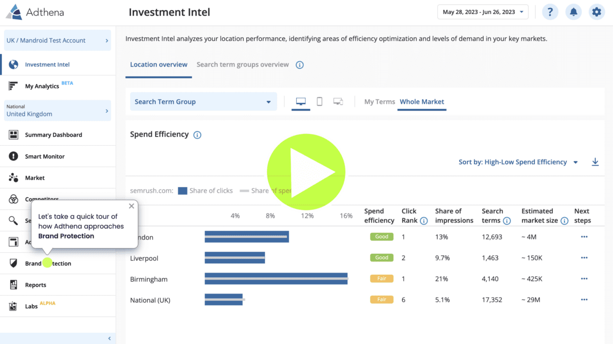 Adthena’s Brand Protection solution lets you continually map and monitor all competitive and partner activity around your brand terms, meaning you can efficiently respond to trademark infringements.