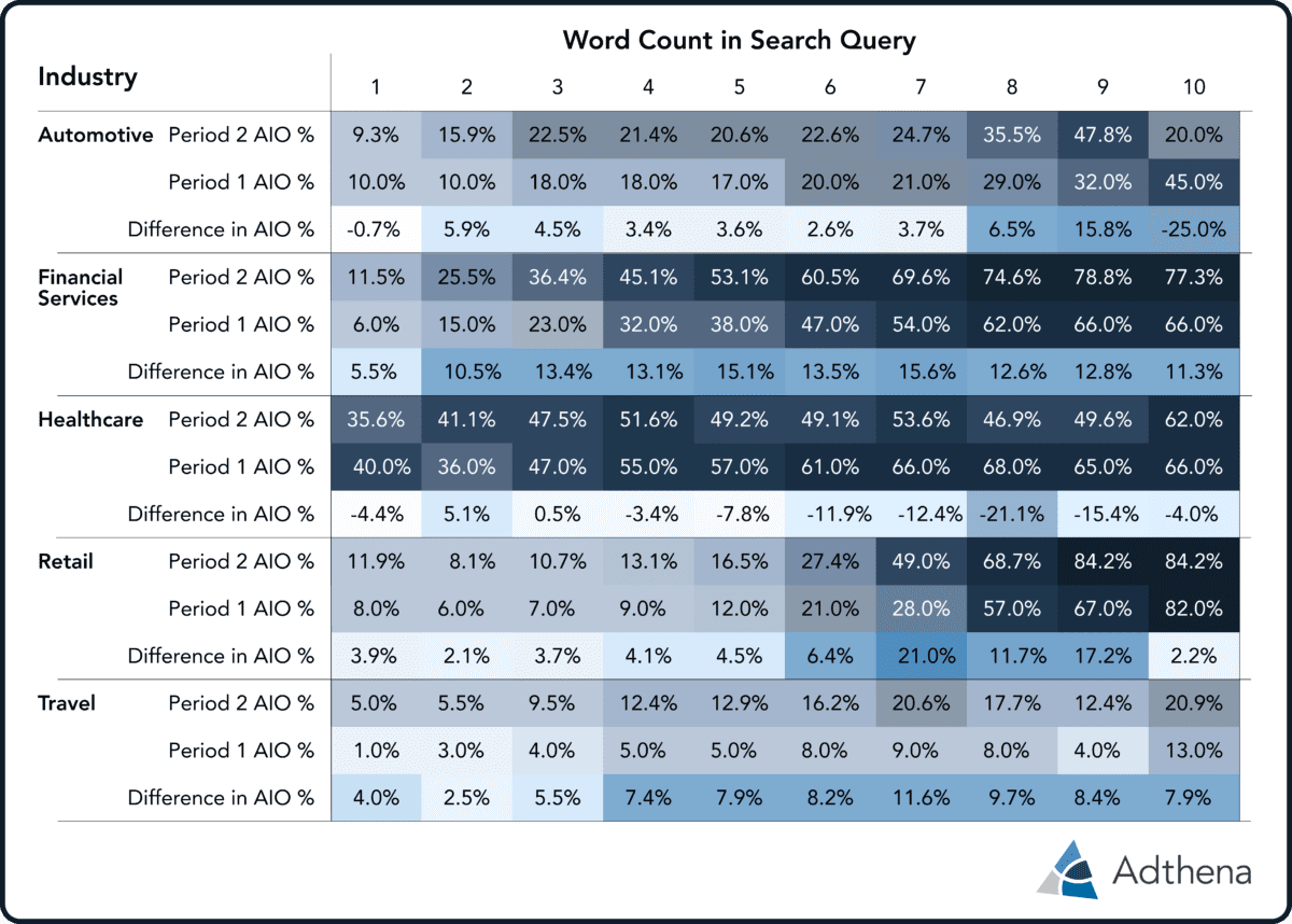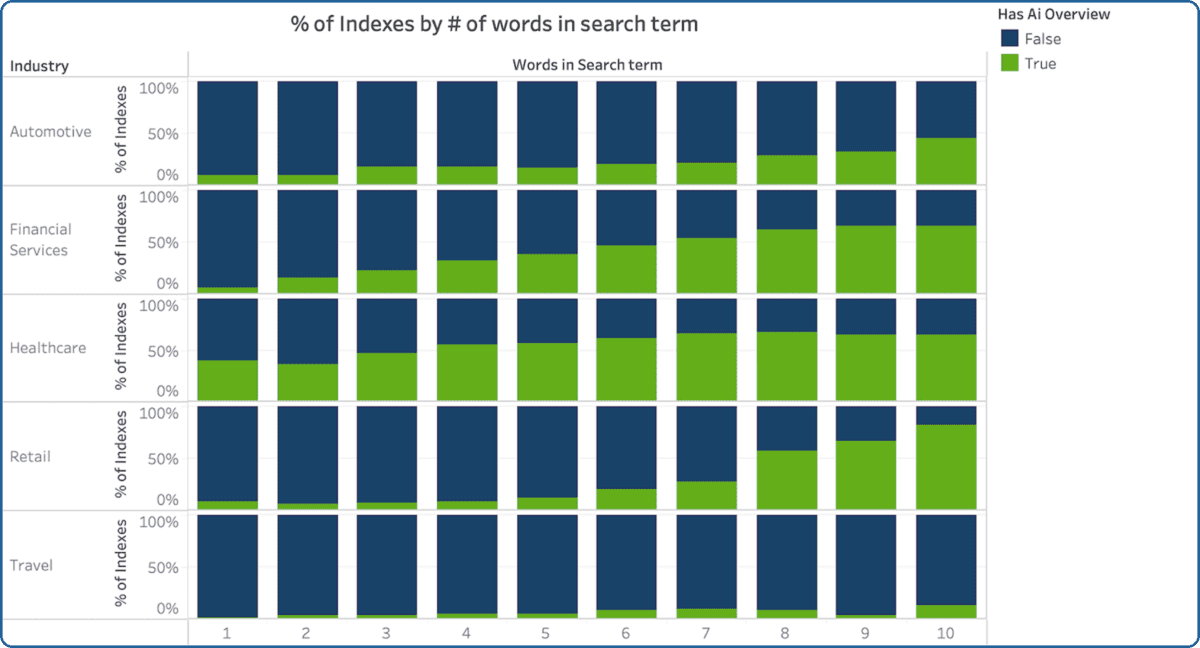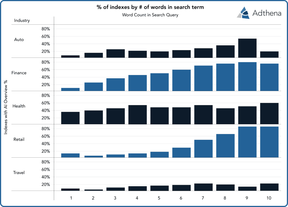 - Retail: AIOs are appearing frequently on “research” queries (6–7 words long), suggesting Google is trying to capture users in the upper funnel before they are ready to buy.